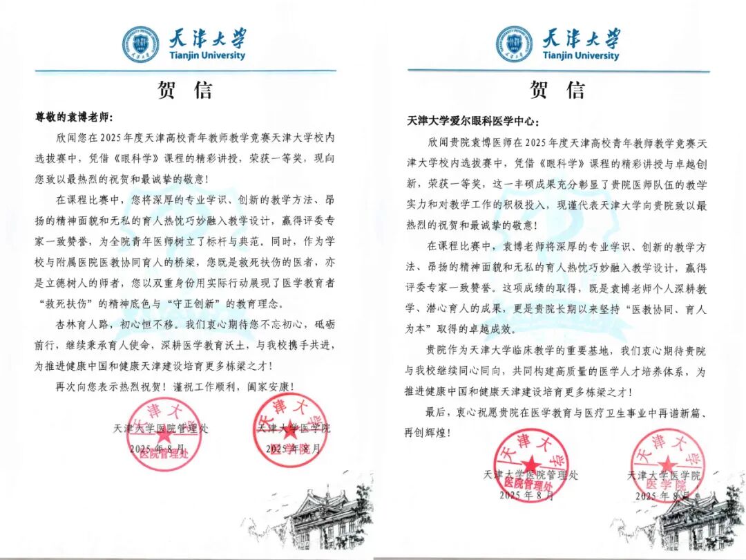 在第41個全國教師節(jié)來臨之際,天津大學(xué)醫(yī)學(xué)院隆重舉行“師者如光 醫(yī)路芳華”優(yōu)秀教師表彰大會。天津大學(xué)愛爾眼科醫(yī)院張婉君主任、梁偉彥醫(yī)生、袁博醫(yī)生憑借出色的教學(xué)及管理表現(xiàn)榮獲表彰。 其中,天津大學(xué)愛爾眼科醫(yī)院張婉君主任榮獲天津大學(xué)第二屆“優(yōu)秀臨床教學(xué)管理干部”榮譽稱號。角膜眼表科梁偉彥醫(yī)生榮獲天津大學(xué)第二屆醫(yī)學(xué)本科見習(xí)“優(yōu)秀帶教老師”榮譽稱號。屈光手術(shù)中心袁博醫(yī)生,在2025年度天津高校青年教師教學(xué)競賽天津大學(xué)校內(nèi)選拔賽中,憑借《眼科學(xué)》課程的精彩講授,榮獲一等獎。杏林育人路,初心恒不移。此次表彰不僅是對三位個人教學(xué)及管理成就的高度認可,更是對天津大學(xué)愛爾眼科醫(yī)院長期以來堅持高質(zhì)量教學(xué)、持續(xù)創(chuàng)新人才培養(yǎng)模式的充分肯定。未來,天津大學(xué)愛爾眼科醫(yī)院將繼續(xù)探索更高效、更人性化的教學(xué)模式,激勵更多教師積極參與醫(yī)學(xué)教育與臨床實踐的深度融合與協(xié)同發(fā)展,為培養(yǎng)具有創(chuàng)新精神和實踐能力的優(yōu)秀眼科人才持續(xù)貢獻“愛爾力量”,助力醫(yī)學(xué)教育事業(yè)蓬勃發(fā)展。